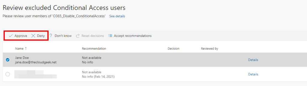 Example of how the access review site looks like when the review is open for change, you could either approve or deny the membership for the specific end-user selected