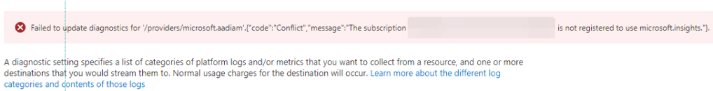 If you get an error message like “(Failed to update diagnostics for ‘/providers/microsoft.aadiam’.{“code”:”Conflict”,”message”:”The subscription ‘XXXXXXX-XXXX-XXX-XXX-XXXXXXXX’ is not registered to use microsoft.insights.”}.)”