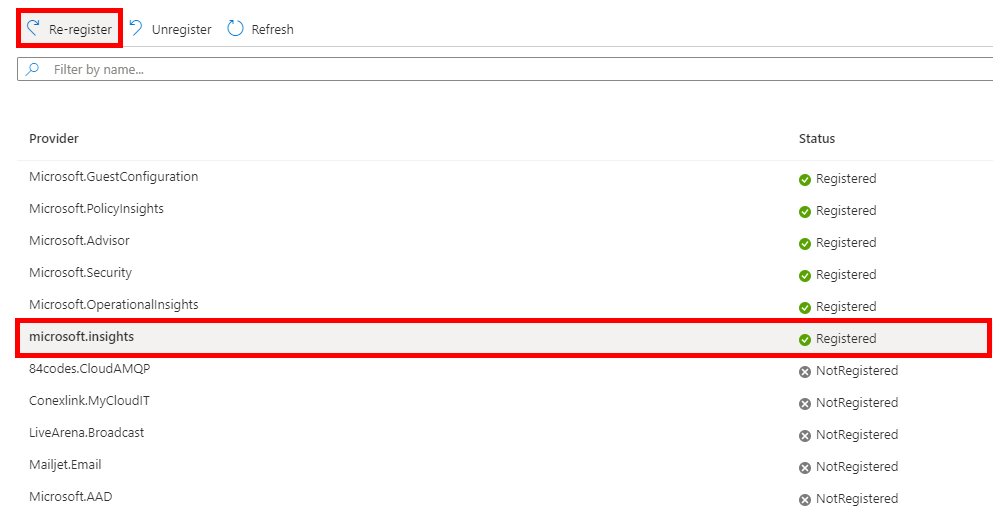 If “microsoft.insights” already is registred, but you are still reciving the error message, try to “re-register”.