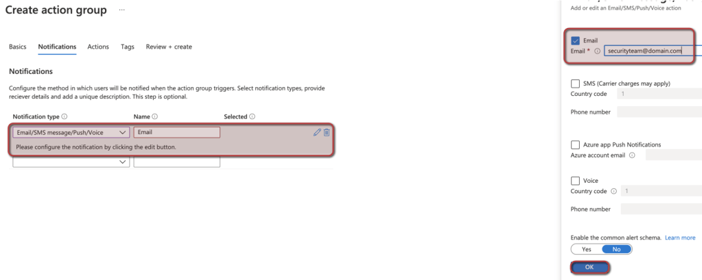 10. Configure your Action group name and Display Name, then go to notifications