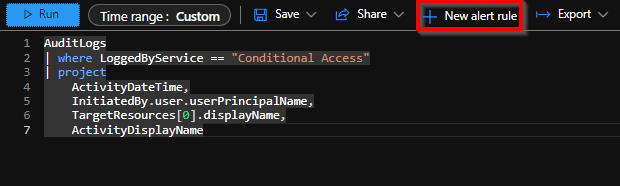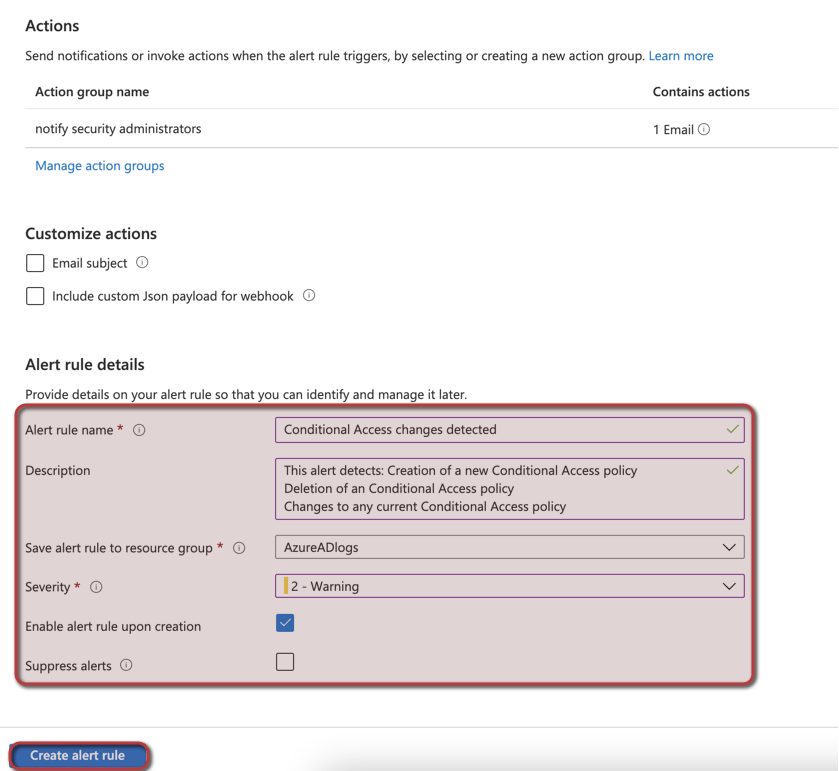 We will create a couple of Azure Monitoring alerts, based on KQL queries and the Azure-AD Audit logs that will alert us when an change have been detected to an Conditional Access policy.