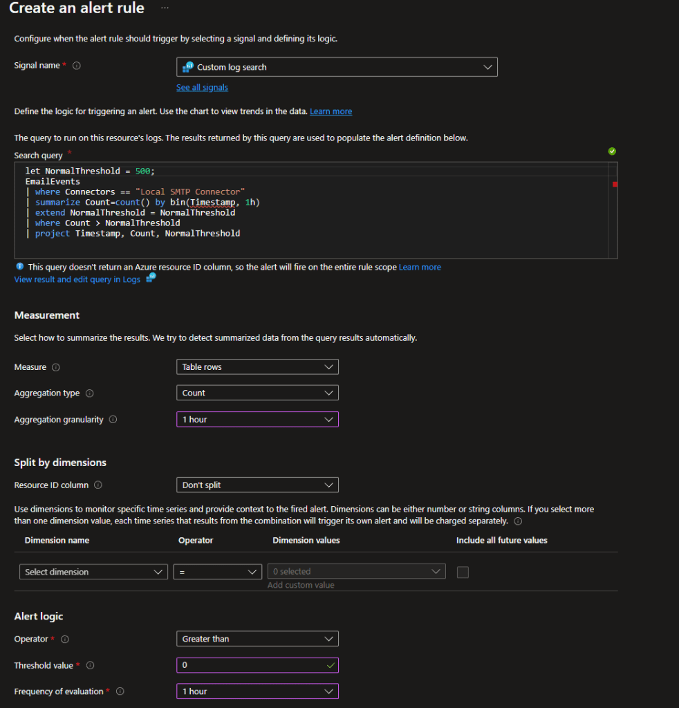 Now, when we can see that we have specific detections over our normal threshold, we can go a head and create a new Alert rule based on the KQL query above.